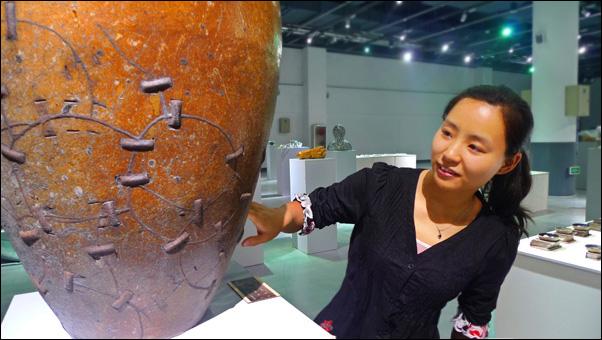 图:观赏者亲手触摸锔艺好的陶器(一)