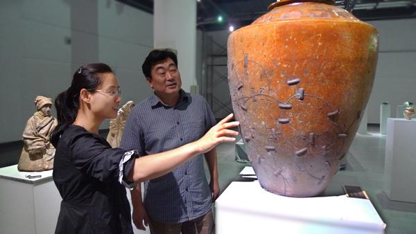 9月9日,在“界尚——中国当代陶艺实验作品展”现场,观众欣赏顾群业的陶艺作品《和合》。