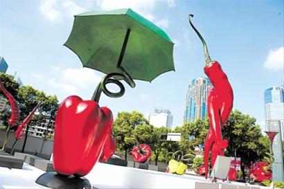 本报讯 (记者 李君娜)神态生动、舞步狂放的红辣椒在黑白琴键上翩然起舞。昨天,由新加坡女艺术家库玛丽创作的2011上海艺术博览会大型主题雕塑 《生命探戈》,在上海世贸商城门口揭幕。