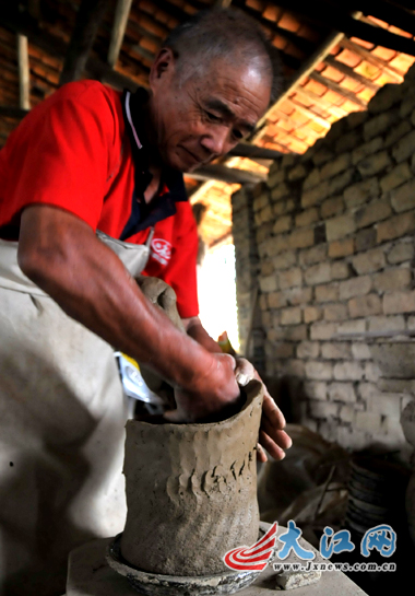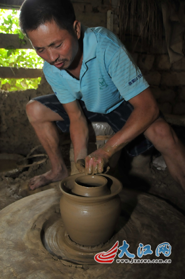 在作坊内,记者看到72岁的江瑞仁正在制作陶器的毛坯。他在泥粉里倒上水,拌成泥团,之后取出一块搓成条状,沿陶底粘好、捏扁。绕粘了几圈后,一件形似水管的陶皿雏形完成。江瑞仁告诉记者,他年轻时,在丰城学手工制陶技艺的人很多,由于销量好,丰城还专门办了陶厂。可随着金属、玻璃和塑料器皿的出现,用土陶的人越来越少,厂子最终倒闭。不过,仍有一部分人,愿意用这种古拙的陶器作为盛酒盛油的容器,因此,古法制陶作坊徘徊在摇摇欲坠的边缘。