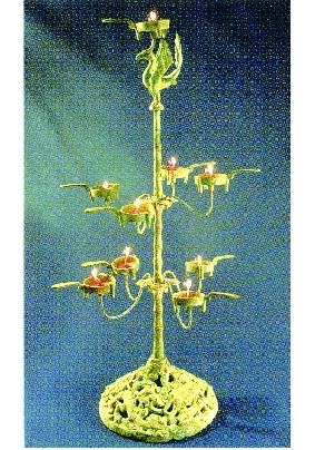 工作人员介绍说,这盏灯是青铜器,九盏莲花,通高97厘米,底座上刻青龙、白虎两对瑞兽。灯柱顶端为一立姿朱雀,双翅振起,翘尾若屏。朱雀头顶与莲枝共托起九只灯盏。