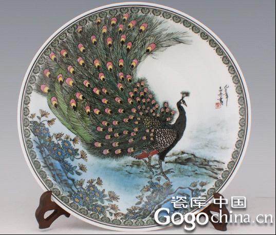 图:釉下五彩大师手绘孔雀图寒江凝翠陶瓷艺术挂盘