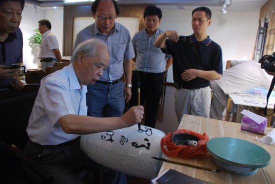 虽说年轻,但笔者和邵老也算是忘年交。一来二往,相识已有五六载,最近一次见面是在景德镇的一次笔会上。一个耄耋之年的老人风尘仆仆从北京来到景德镇,自然不是旅游这么简单。他虽说不是第一次来景,但和上一回也已相隔12年有余。若不是为家乡淳安千岛湖艺术馆的开馆进行陶瓷书法创作,邵老恐怕至今也无缘见到自己为景德镇雕塑瓷厂大门题写的“艺术瑰宝”四字。