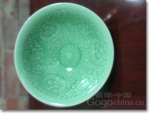 图:青瓷弟窑梅子青刻花牡丹碗-艺术瓷盘碗