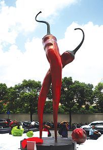 本届展会的另一大亮点是由新加坡女艺术家库玛丽创作的大型雕塑《幸福探戈》,今年被确定为艺博会的主题雕塑作品,并被放置在举办场馆世贸商城门口最显著的位置。《幸福探戈》高达六米,以两只体态修长的红辣椒为探戈舞的主角,神态生动,舞步狂放,使人的耳畔与双眸仿佛能够鲜活地听到并看到节奏明快、华丽高雅、变化无穷的探戈在热烈舞动。