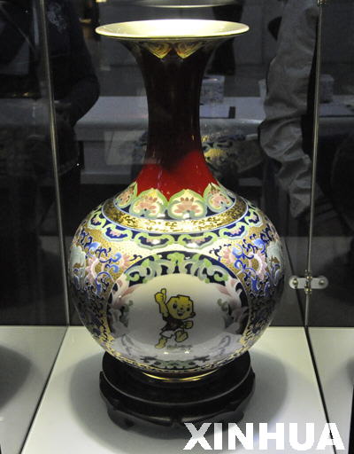 一楼展厅入口处,一只画面熟悉的“泰山童子送福”瓶吸引了人们的目光,该瓶于2009年全运会前夕打造完成。瓶的一侧是手绘的五彩全运会标识,另一侧是象征着力量的泰山童子形象,瓶颈部位是颜色奇正的红釉,向下是一圈24k描金。据说这种限量版的红釉五彩描金瓶现在存量只有8只,其他或作为礼品赠送外国友人或被重金收藏。在“泰山童子送福”瓶外侧,是上海世博瓶和北京奥运瓶,均出自大汉窑名师之手。