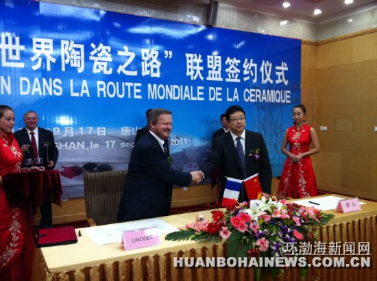 环渤海新闻网消息 9月17日,唐山市政府与法国利摩日市政府在唐山宾馆举行唐山加入“世界陶瓷之路”联盟签约仪式,双方就陶瓷领域内多边和双边合作达成了长期合作共识,两市政府代表签署了协议。