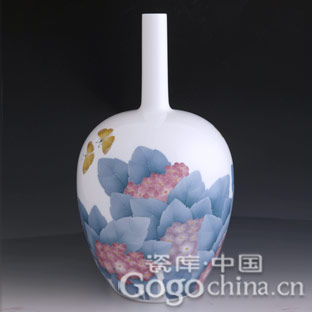 图:张玲大师手绘釉下五彩瓶·高档瓷器蝴蝶自在花卉瓶