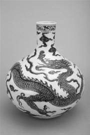 记者曾看到这个国宝级“天球瓶”,直颈、溜肩,球型鼓腹,最鼓处需要成人双手合抱。工艺十分复杂。圆腹通体画一回首腾云飞奔的行龙,张口、吐舌、露牙、双目圆睁、四肢伸展。明代宣德青花瓷器在中国陶瓷发展史上占有重要地位,而“天球瓶”又是宣德瓷器的重中之重,生产数量稀少,现在传世品微乎其微,市场上基本有价无货,因此专家给其评估价为3亿元。