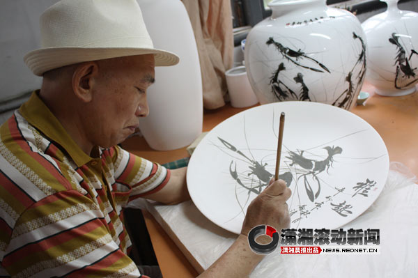 (9月19日,醴陵元诏瓷业公司,中国书画家钟乔清在瓷胚上现场画虾。