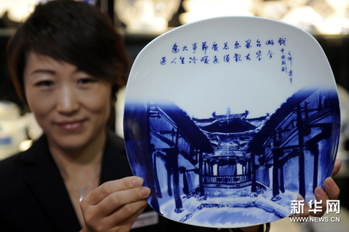 9月22日,景德镇乐平市珠海北路一家陶瓷专营店工作人员在展示“搬”上10寸方盘的古戏台文化。