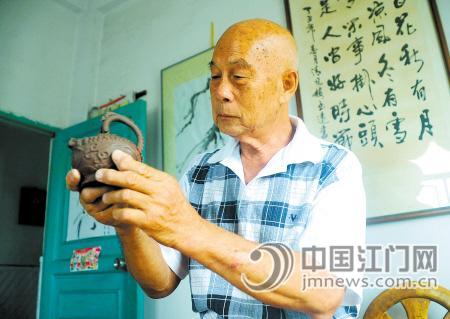 潮连聚龙新村的一栋民宅里,81岁的潘锦畴老先生在自家书房里忙个不停。他端坐在大方桌前,拿起一小块准备好的瓷泥,用手搓成柱状,在圆转盘上依次摞起,很快,塑成圆形,不时用手沾水,将圆形的瓷坯修刮整齐、匀称……潘老先生这次打算做个陶瓷茶壶。