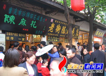 麻花是瓷器口的品牌小吃,到瓷器口随便走一圈,就可看到30多家卖麻花的小店。其中打着“陈麻花”招牌的就有12家。这些麻花店的生意个个都火爆,家家都要排队才买得到。所以游客到磁器口去都会品尝一下重庆的特产古镇麻花。
