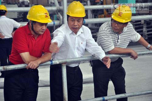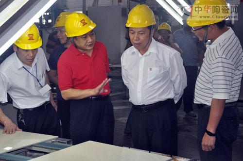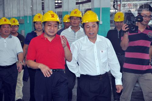 嘉俊陶瓷副董事长陈耀强(右1)陪同恩平市委书记李灼冰(左1)一行参观调研