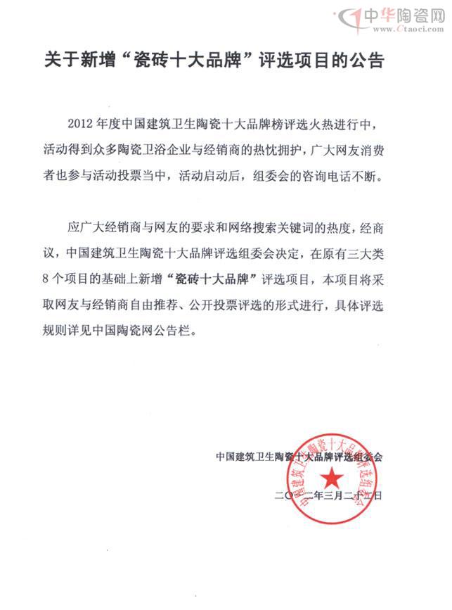 1、2012年3月至2012年4月,网友可在中国陶瓷网论坛关于“瓷砖十大品牌”评选社区进行公开投票,以账号进行投票,禁止违规操作,投票结果占评选比重的30%。