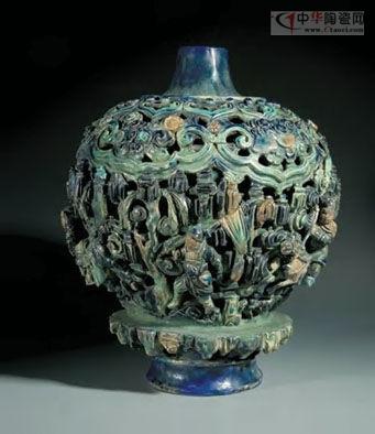笔者在藏友孙先生家见到的这个法花镂空人物瓶就可以称得上是不可多得的艺术品。该瓶直口,细短颈,圆肩,弧腹,下有底座,圈足。颈和足施蓝釉,通体施孔雀绿釉,点缀有松香黄釉。瓶身镂空,雕刻有山水人物,前有走卒扛旗,后有大将骑马举刀,行在山中,似为行兵打仗图,其中当有典故,恕笔者孤陋寡闻,不能尽知其含义。瓶身上方有兰花图。底座雕刻成参差不齐的锯齿状,却显出山的陡峭,使画面看起来更为真实。瓶的整体经过镂空雕刻,立体感倍增,让人遥想当时夜月之下急行军的紧急与迫切,穿过时空的长河,仍能嗅到山的幽静,花的清香,仍能听到人、马疾驰奔走的脚步声和马蹄的踢踏声。