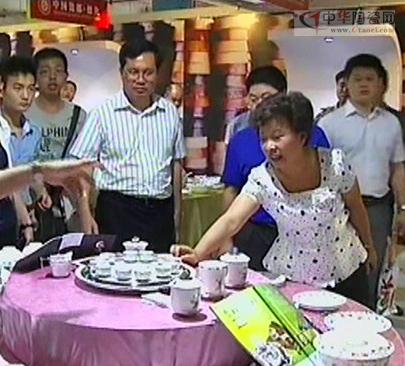 【同期声 福杰陶瓷有限公司内销业务员 张光华:这是我们公司新推出的一块富贵吉祥转盘茶具,它可以传动,让顾客使用起来更方便。】