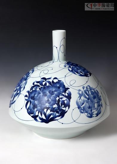 邹乐陶瓷作品现代青花《风随花动》。