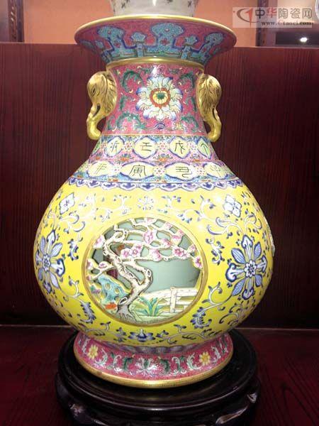 仿清乾隆粉彩镂空开光花卉纹象耳转心瓶