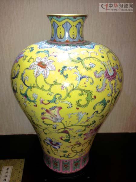 仿清乾隆黄地粉彩轧道花卉纹梅瓶
