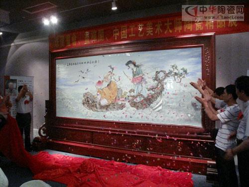 在开幕式举行之前,已有众多的观众早早来到现场,亲睹大师的作品。走进展厅,可以看到有三块巨型瓷板仍被红绸布遮挡,显得格外神秘,这三件作品分别是中国工艺美术大师王隆夫2010年创作的4.1米X1.7米的青花瓷板《八百千秋》,2012年刚刚完成的4米X1.68米粉彩瓷板《南极星麻姑仙同往瑶池赴寿宴》,及中国工艺美术大师张育贤3.8米X1.58米的粉彩瓷板《神州珍宝》。《八百千秋》是王隆夫绘画的景德镇2010年世界最大青花瓷板,《南极星麻姑仙同往瑶池赴寿宴》是目前世界上最大的粉彩瓷板,《神州珍宝》则是王育贤耗费多年时间完成的珍品。当《南极星麻姑仙同往瑶池赴寿宴》被揭幕赢得全场赞叹时,本次活动的策划人胡晖向观众介绍,以前,在景德镇绘画80X80厘米的瓷板都是要向有关方面上报的,如今这三件巨型瓷板能够问世,也是大师花费大量精力完成,实属难得。