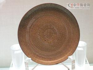 天津博物馆藏宋哥窑盘高3.2厘米、口径18.6厘米、足径5.6厘米。胎骨呈土黄色,米黄色釉,布满纵横交错、深浅不一的开片纹,“金丝铁线”纹路清晰。釉质纯厚,不甚莹澈。釉内多有气泡,如珠隐现,故通称“聚沫攒珠”。盘内外釉点明显,是气泡破裂所致,为传世哥窑的典型器物。