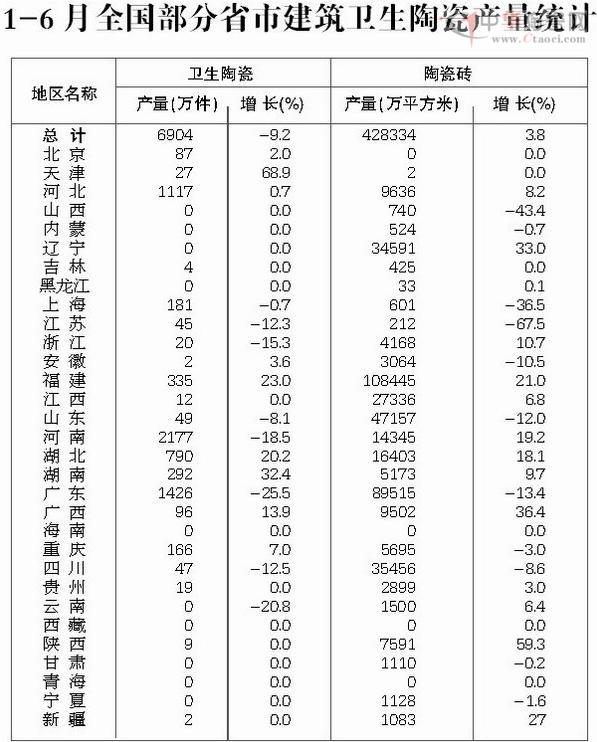 1-6月全国部分省市建筑卫生陶瓷产量统计