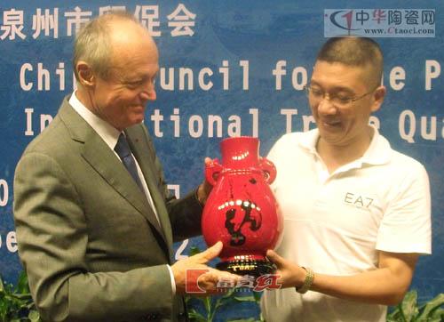 9月10日,在泉州市迎宾馆迎宾楼召开的匈牙利中国品牌产品贸易中心项目推介会上,泉州市陈荣洲副市长代表泉州市人民政府和泉州民众向远道来华的匈牙利国家前总理迈杰希赠送了富贵红陶瓷《天赋灵犀》。
