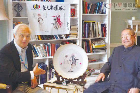 图为奥运书法家都本基和奥运画家李文培在伦敦奥运之家正在向媒体介绍由中国唐山元亨艺术陶瓷制作的奥运艺术陶瓷精品