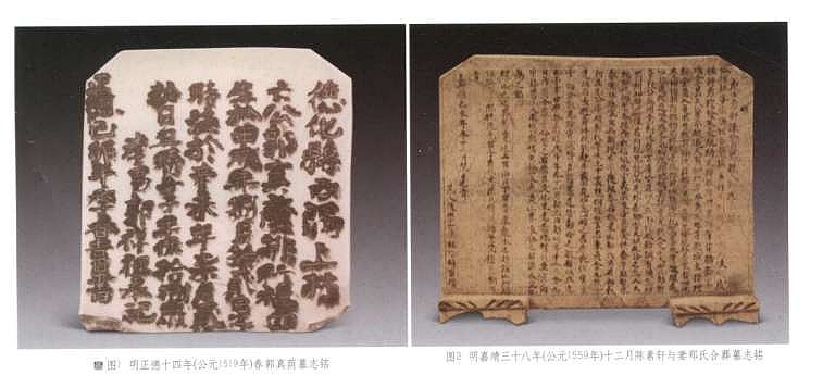 明嘉靖三十八年(1559年)十二月陈素轩与妻郑氏合葬墓志铭(图2)瓷板横式方形,上额两旁作斜角,下端左右附贴有凸出板平面的呈横式双拱形的承托底座。高17.5厘米,宽22厘米,厚0.5厘米。胎骨质坚细腻,俗话称糯米胎。釉面肥厚滋润,胎釉中闪浅肉红色。釉面有脱釉。款字青料色泽呈现蓝中微泛紫的浓重,但字迹清晰。书写有“殿士素轩陈公与节孺人郑墓……嘉靖己未年冬十二月口日之吉”等共484字,记录了死者的生平事迹。据墓志铭中记载,志主陈素轩先于其妻郑氏谢世,时郑氏年未满30岁。嘉靖三十七年(1558年)冬十一月初六日郑氏卒,翌年十二月廿九日合葬于陈素轩之右。墓志铭则为郑氏入葬时制。