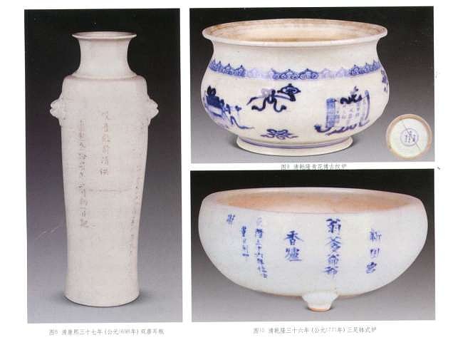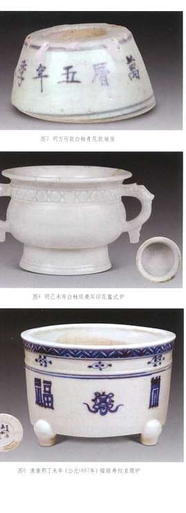清康熙丁未年(1667年)福禄寿纹直筒炉(图6)高14厘米,口径20厘米。手拉坯成型,器呈圆口,炉身作筒状,底接实心三足。炉底书写“丁未年孟秋奎山置”青花款。
