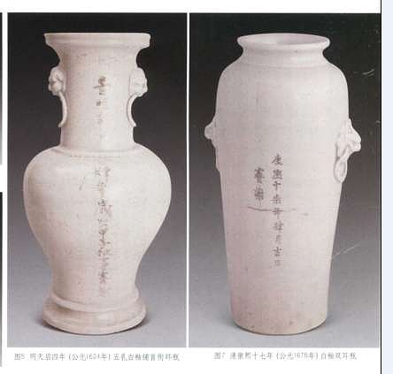 明天启四年(1624年)白釉铺首衔环瓶(图5)撇口,溜肩,鼓腹,平底略带圈足,瓶的颈部两侧附贴对称的狮首衔环。乳白釉色的瓶体竖写青花铭款“时明朝天启肆年岁次甲子秋吉赛谢”15字。青花色呈蓝中带灰,白胎瓷化较好。