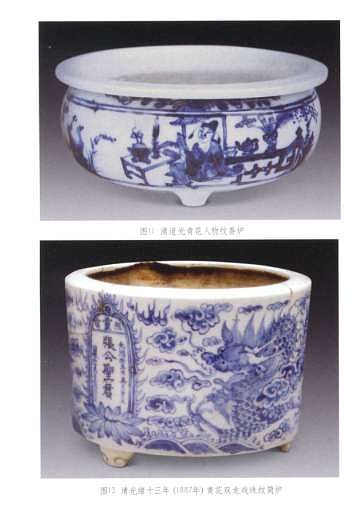 清道光青花人物纹香炉(图11)高9厘米,口径12厘米。炉底书写“招财进宝大清道光十年德美堂置墨”款。此炉胎釉莹润,白中泛青色,青花色呈蓝中带青。
