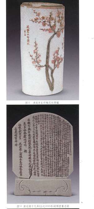 清光绪十九年(1893年)昊缉堂墓志铭(图14)墓志分为文字板和底座两部分,瓷板近长方形,上额微拱圆形,下端两旁作斜角。板中部最高处为24.7厘米,两旁高分别14.5和15厘米,面宽20厘米。板面书写青花“皇清奉直大夫吴缉堂公墓志……”等共512字铭文。底座呈横式扁方形,中部内凹可供瓷板竖立。底座正面刻划简单的“蝠”形图案,寓意“福”。白釉微泛黄,青料色调泛黑。根据铭文记载,吴缉堂生于清嘉庆二十二年,卒于光绪十六年(1816-1890年),葬于光绪十九年(1893年),墓志铭为安葬时所立。