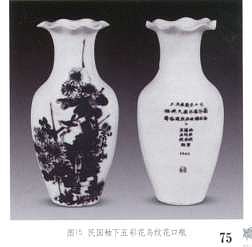 民国釉下五彩花鸟纹花口瓶(图15)高26厘米,口径10厘米。瓶口有如开放的花瓣,颈部微撇,圆腹,整体以变化的弧线构成柔和匀称的瓶体。器物背腹壁书写“一九四三年……”等字款,底有“许光月制”四方形印章。许光月(1906-1984年),福建省德化县城关湖前人,又名文照,别号渔父。一生从事陶瓷60余年,是将瓷彩、造型设计、釉料配方等集于一身的民间知名艺人。