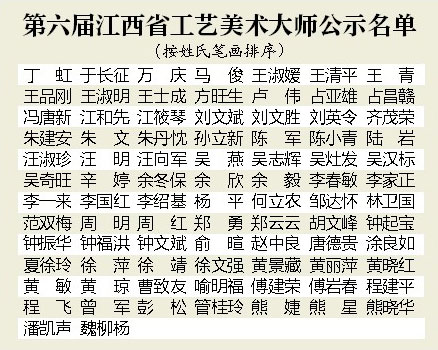 去年5月12日,省工信委在官网发布了江西省前五届中国工艺美术大师的名单,共26人。如果加上去年出炉的6人,江西“国大师”已达32人。