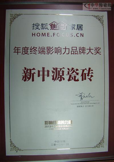 2013年1月17日,“影响终端的力量”2013家居新视角论坛在深圳京基100大厦瑞吉酒店隆重举行。来自众多机构协会和知名企业的领导、领袖企业家及行业精英等共300余名行业嘉宾莅临现场,围绕以终端用户为中心的话题,全面探讨了家居行业的现状与发展,探寻影响终端的力量。同时主办方联合中国建筑装饰协会、中国建筑卫生陶瓷协会及中国家具协会等支持机构共同对2012年度终端表现突出的家居品牌进行表彰和鼓励,新中源陶瓷凭借卓越的行业美誉度和强大的终端品牌影响力,荣获“年度终端影响力品牌”。