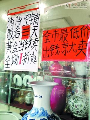经过几天的走访,记者发现,广州街头的这些景德镇陶瓷展销会多分布在天河商圈、江南西商圈、上下九商圈等旺地,多是短期租赁经营,店内店外悬挂着的促销广告也都如出一辙,不是“清货空铺,最后1天,黄金当铁卖”,就是“全场一折起”等。