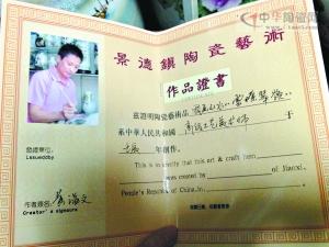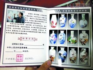 在滨江东路一家景德镇瓷器展销会店铺,只见一个青瓷花瓶旁放着一份封皮皱皱巴巴的“收藏证书”。记者发现,这些证书印刷粗糙,多为相纸打印。证书左侧一般印着“名家”简介,右侧则是一幅或多幅瓷器作品的照片。记者在网上搜索,发现一些作品确实能与这些名家的作品相对应,但却无法辨别真伪。