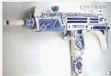 网友晒出的青花电视机、冲锋枪、苹果等PS照片。