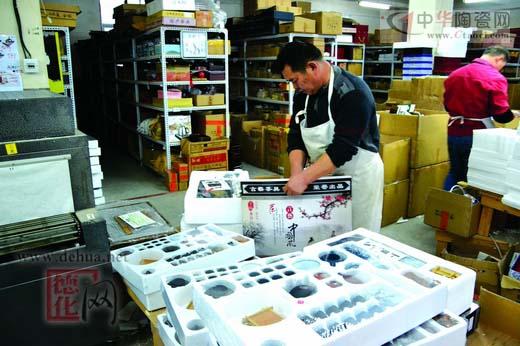 傍晚时分,在“言艺茶具茶品”的仓库间,工人们紧张忙碌着,为当日成交的网络订单包装发货。
