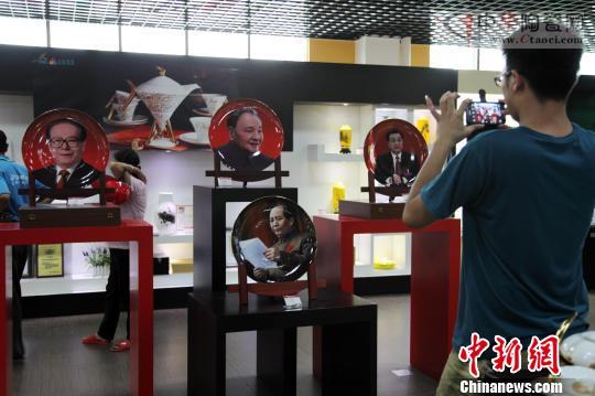 4月19日,在中国广西北流国际陶瓷贸易城,主席像艺术瓷吸引观展民众眼光。