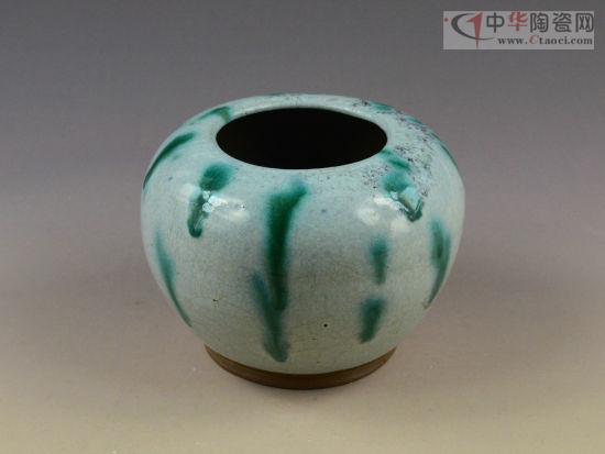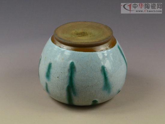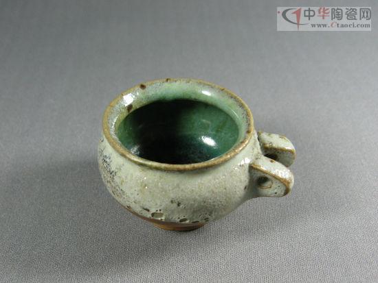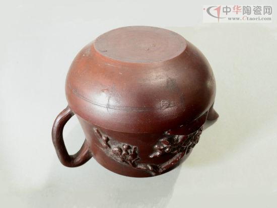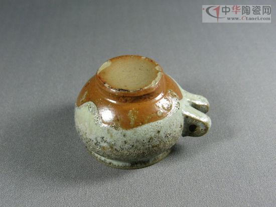 图2-1宋代荣昌沥彩壶是成都玉垒山房的藏品,它是荣昌早期的紫砂类陶器作品。我们知道,江苏宜兴用紫砂泥制陶始于宋代,最早有确切年代的器物,就是南京中华门外马家山油坊桥明嘉靖司礼太监吴经墓出土的紫砂提梁壶,墓志标明入葬于嘉靖十二年,即公元1533年。这把荣昌泥制沥彩壶的器形,具有明显的五代至北宋时期的巴蜀古陶瓷特征,它是荣昌陶器具有千年历史的物证。它的胎体由红泥制作,它肩部两侧的花卉图纹用白泥浆沥彩而成,花簇繁茂而灵动。它是一把执壶的同时,又是一件难得的艺术作品,这表明荣昌陶器的制作者从一开始就追求艺术性与实用性的结合。图2-2是它的底部,从图中可以看出其平底略呈下凹状,底的这种形态一直延续到近代,可以说平底下凹是荣昌陶器的一个特征。图3-1、图3-2的贴刻花素烧壶为晚清作品,其盖为后配。它素胎无釉,跟宜兴紫砂相似,其两侧有贴刻的梅花,美观大方。图4-1、图4-2的朱砂釉胆瓶是典型的清代器物,釉面光亮多变化,含蓄而生动。图5-1、图5-2是件清代月白釉绿彩水盂,属文房用具,文房类是荣昌安富镇陶器的一大门类。由于荣昌陶泥质地细腻,可塑性强,烧结变形小,非常适合制作小巧玲珑的薄胎器物,因此有“泥精”之称。在这件水盂的月白色乳浊釉中饰条与点状釉下绿彩,看上去大有唐代邛窑遗风,不免引起研究者对巴蜀陶瓷文化的万千思绪。图6-1、图6-2的清代鸟食罐白色胎,外饰乳浊月白釉,内饰绿釉,加上火石红,呈现三种色彩。从唐代到民国,巴蜀古陶瓷鸟食罐甚多,这跟自然条件下的民俗文化有关。图7是一对清至民国的尖底鸟食罐,素胎有白泥贴花。用红白二泥互为装饰,也是荣昌安富镇陶器常用的装饰手法。图8是清至民国时期的红丹釉倒流壶,所饰之釉鲜红光亮,如南红宝石一般。倒流壶又叫倒注壶、倒灌壶、倒装壶、内管壶等,这一充满科技与趣味的品种在古代陶瓷中是比较稀少的。这件作品呈桃形,又是喜庆的红色,真是件不错的祝寿礼品。图9是件清至民国的龙纹穿带扁壶,它应是一个便于携带的酒壶。虽然它属于粗陶类品种,但是那只经沥、贴、刻、划而成的从天而降的黄龙,是多么地刚毅有力,真是一件大写意佳作。
