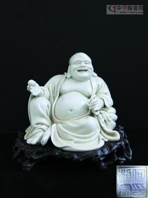 德化瓷雕的题材除动植物形象外,更多是独立的人物造型,其中以佛道人物题材居多。这些瓷雕背部往往有“何朝宗”“林朝景”等瓷雕匠师的印款,其中以何朝宗的最为著名。此件弥勒佛现藏于苏州古玩城的德存轩,即为何朝宗之作,其胎骨坚细洁白,形体厚重,釉色温润如玉。弥勒佛双耳垂肩,盘膝曲腿,席地而坐,袈裟夸大,衣带飘逸,大有曹衣出水、吴带当风的韵律。其袒胸露腹,笑意满面,双眼炯炯有神,姿态生动自然,雕刻手法细腻,线条圆润,惟妙惟肖,极富神韵,背后隐约可见“何朝宗印”款。