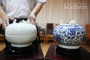吴馆长介绍说:“茶叶罐共有两款,一款属于青瓷,一款属于青花瓷。它是用瓷石和高岭土等优质原料,经过1200℃-1400℃的高温烧制而成,每件制作工艺复杂,不是简单的复制古文物,还具有现代的审美观及实用性,只能限量发售。而三羊开泰茶叶罐不仅具有极高的观赏价值,它还是一个储藏茶叶的容器。