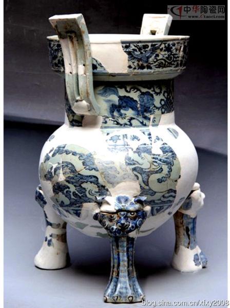 镇江京口闸遗址考古发掘的元代器物中,除两鼎元代青花海水龙纹香炉而外,陶胎孔雀绿大香炉一只,卵白釉大瓶二只。镇江市文广新局文物处处长张小军介绍,清代京口闸位于镇江市中华路打索街与小营盘巷口附近,经国家和省文物局批准,经过一年的工作,考古工作人员在中华路地块先后发现了明清石闸、码头、石岸、道路、碑亭等遗迹;宋元时期河岸、道路、建筑基址等遗迹。京口闸遗址工地出土的遗物标本有数百件,时代跨度从民国至北宋时期,器类以陶瓷等日常生活用品居多,建筑材料类次之,另有少量祭祀用品。镇江京口闸遗址元代瓷器的发现,为我们研究元代瓷器和元代瓷器运输交通情况,提供重要的实物依据。
