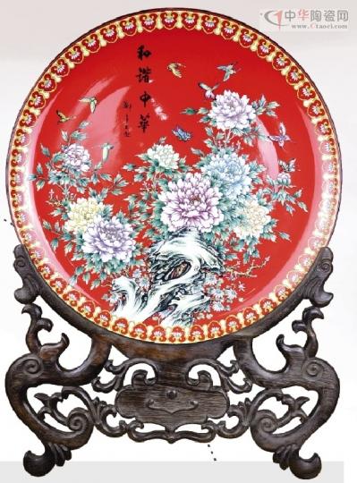 挂盘,是平时生活中常见的盘子,在经过艺术加工后,形成的一种极具有观赏性的工艺装饰品,俗称“艺术盘子”。此款珐琅彩挂盘上饰“九蝶九花”, 以九九归一,盛喻四海同心的中华盛世,再加上“中国红”地的明亮色泽,让这幅“和谐中华”图更显喜庆祥和。