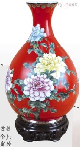 玉壶春瓶又叫玉壶春壶,是宋瓷中具有时代特征的一种典型器物,从当时的一种装酒的实用器具,后来逐渐演变为现在的具有观赏性的陈设瓷器。“荣华富贵”一词出自《管子・重令》:“而群臣必通外请谒,取权道,行事便辟,以贵富为荣华以相稚也,谓之逆。”多用来比喻兴盛或显达。荣华富贵图是我国传统的吉祥图样之一。它以芙蓉花、牡丹为主,“蓉”与“荣”同音,花即华,牡丹为花中王,旧称富贵花,即“富贵”。这两种花的结合,寓意着富贵荣显。