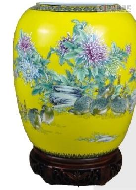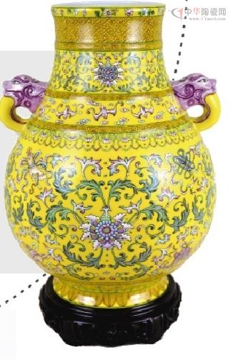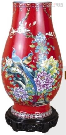 冬瓜瓶起源于清乾隆年间,是传统瓷器花瓶器型之一,敞口短颈,瓶身圆润丰满,因貌似冬瓜而得名。景德镇烧制较多,起初为皇宫贵胄烧制。后因造型大气,且有福如东海,寿比南山之意,受到各阶层喜爱而流传开来,成为清朝以来典型的花瓶器型。此款珐琅彩大冬瓜瓶,是冬瓜瓶的变形,它将瓶身进行一定比例的拉升,使得器型更显高贵和大气,加上瓶身上纯手工绘制了象征着富贵、吉祥、幸福、繁荣的“花中之王”――牡丹,在“中国红”地与“帝王黄”地珐琅彩的衬托之下,彰显出独一无二的雍容华贵、国色天香,非常适合高档场合的摆设及收藏。