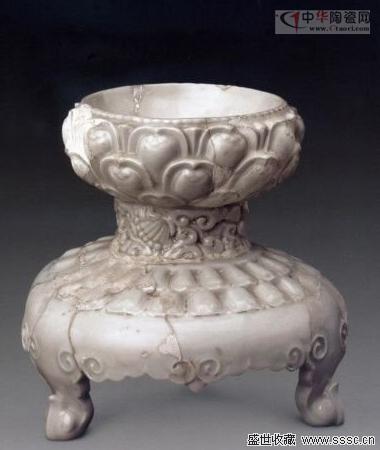 永乐白釉浮雕莲瓣纹束腰三足座 高19.3厘米 1983年景德镇珠山御窑厂出土。